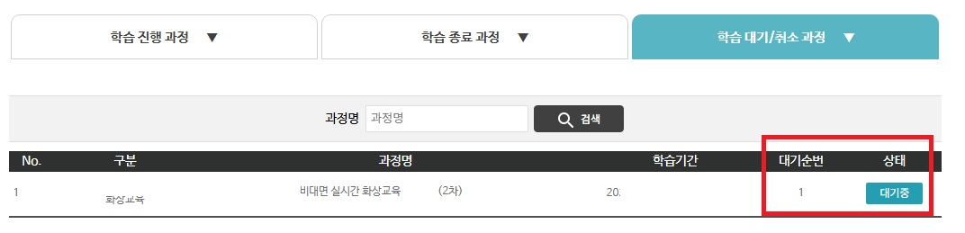교육이 마감된 경우는 대기신청이 가능하다. 마감된 교육 우측의 '대기' 버튼을 클릭하면 된다.
