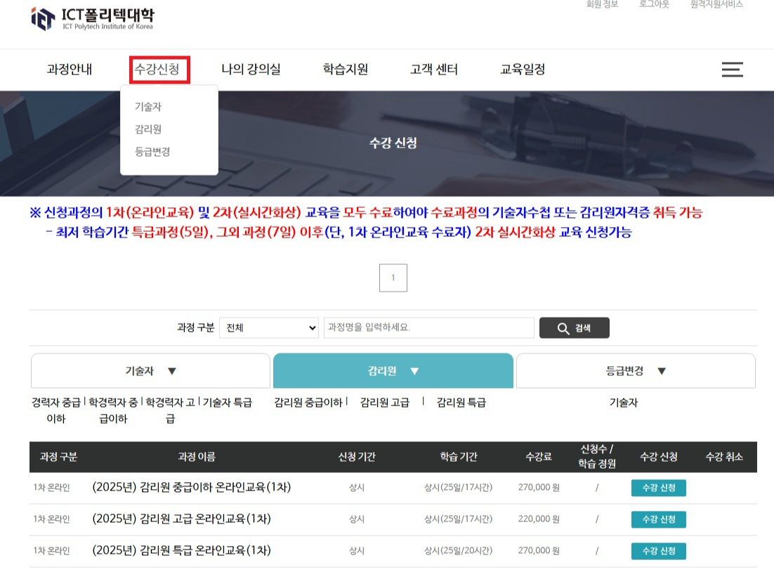 수강신청은 '수강신청' 메뉴에서 기술자나 감리원에 맞는 메뉴를 선택하여 신청하면 된다. 등급변경 교육도 여기서 신청 가능하다.