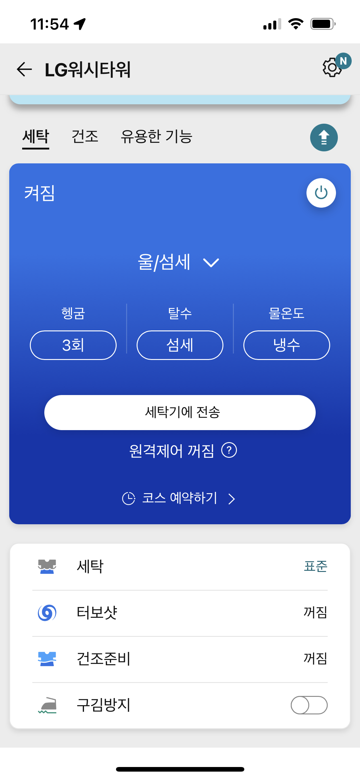 여기서 세탁기에서는 하지 못했던 섬세한 세탁조건 등을 설정할 수 있다. 울/섬세코스도 가능하고 선택을 한 뒤에 '세탁기에 전송' 버튼을 누르면 세탁기로 세탁조건 데이터가 전달된다. 세탁기에 가서는 세탁 버튼만 눌러주면 내가 지정한 코스대로 세탁이 됨.