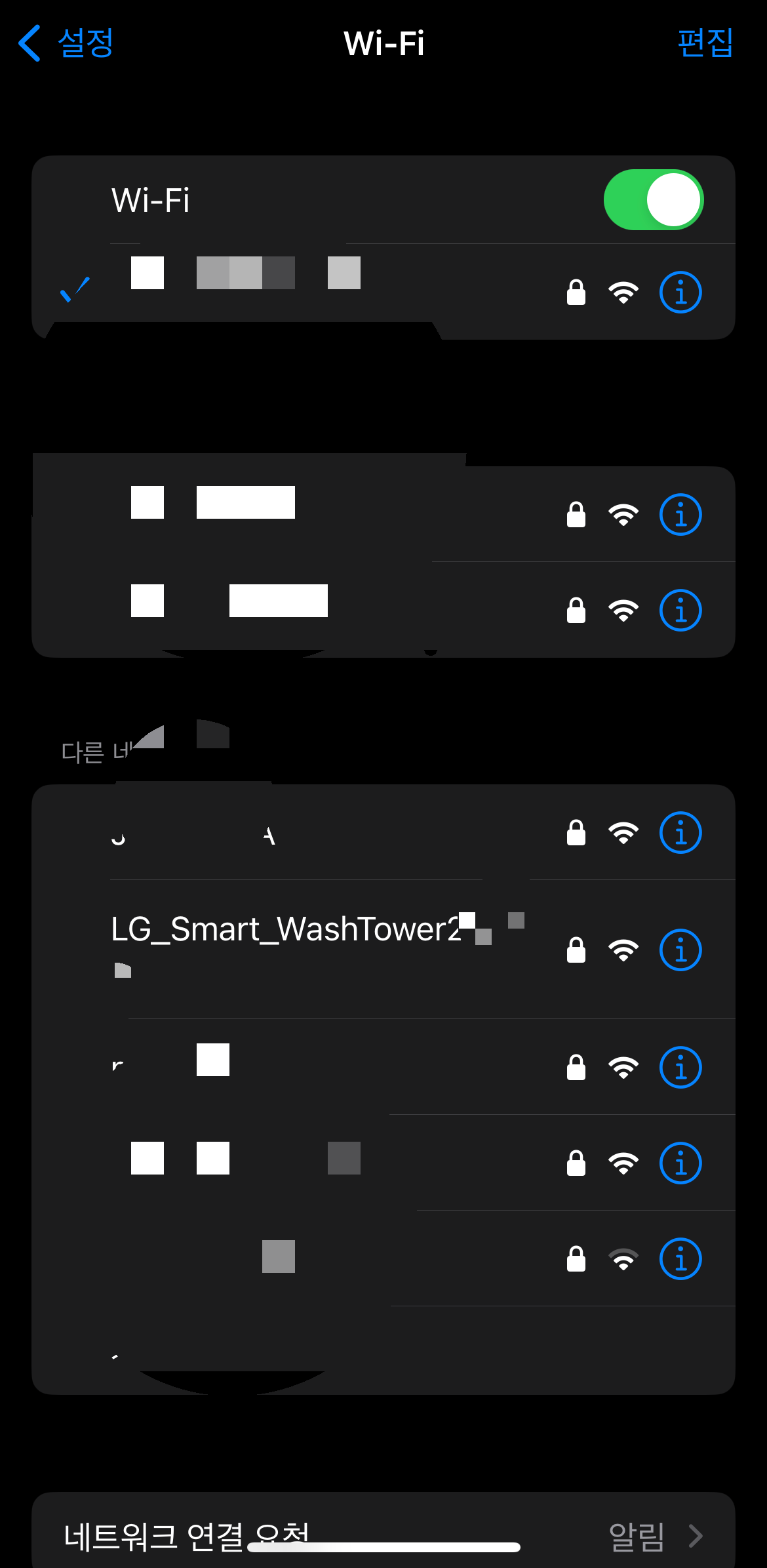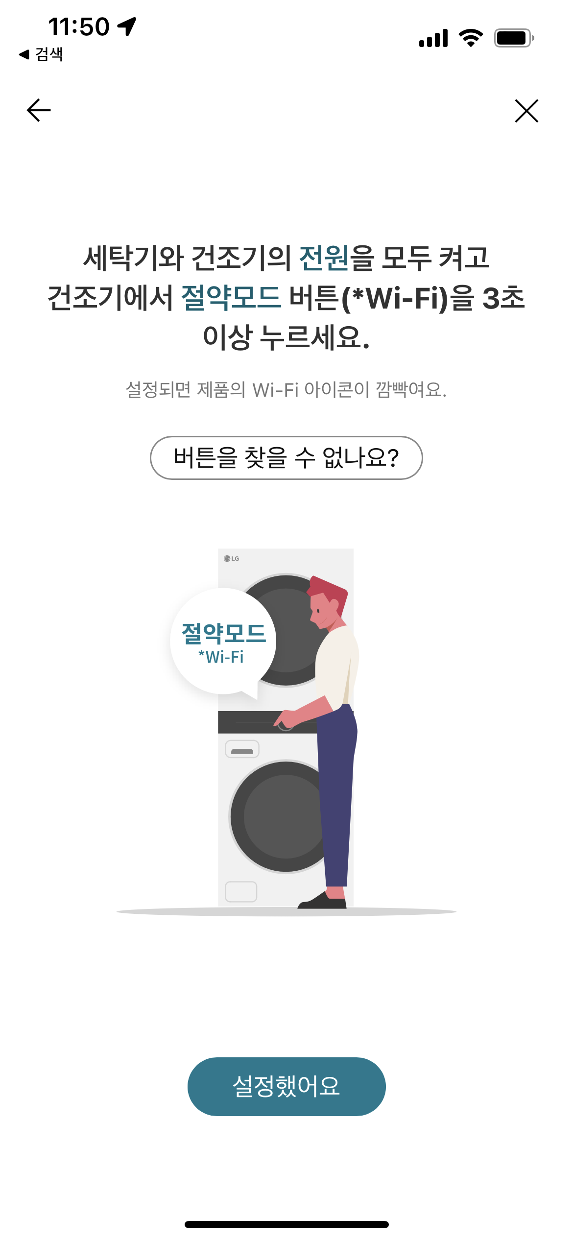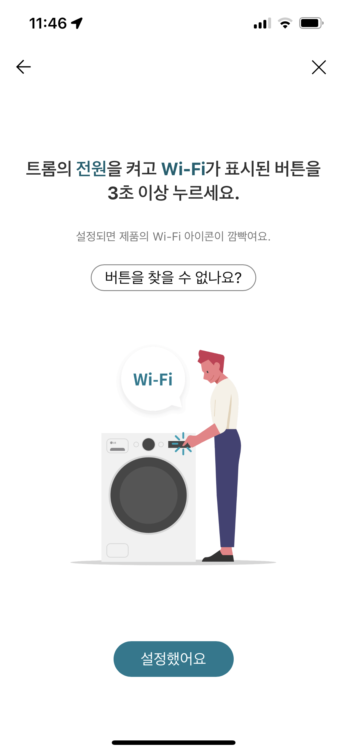 이후는 위의 과정과 유사하다. 와이파이 버튼 3초 누르고 세탁기의 와이파이에 연결하면 된다.