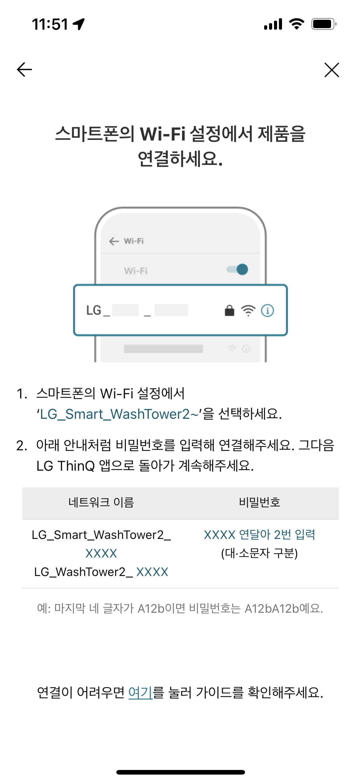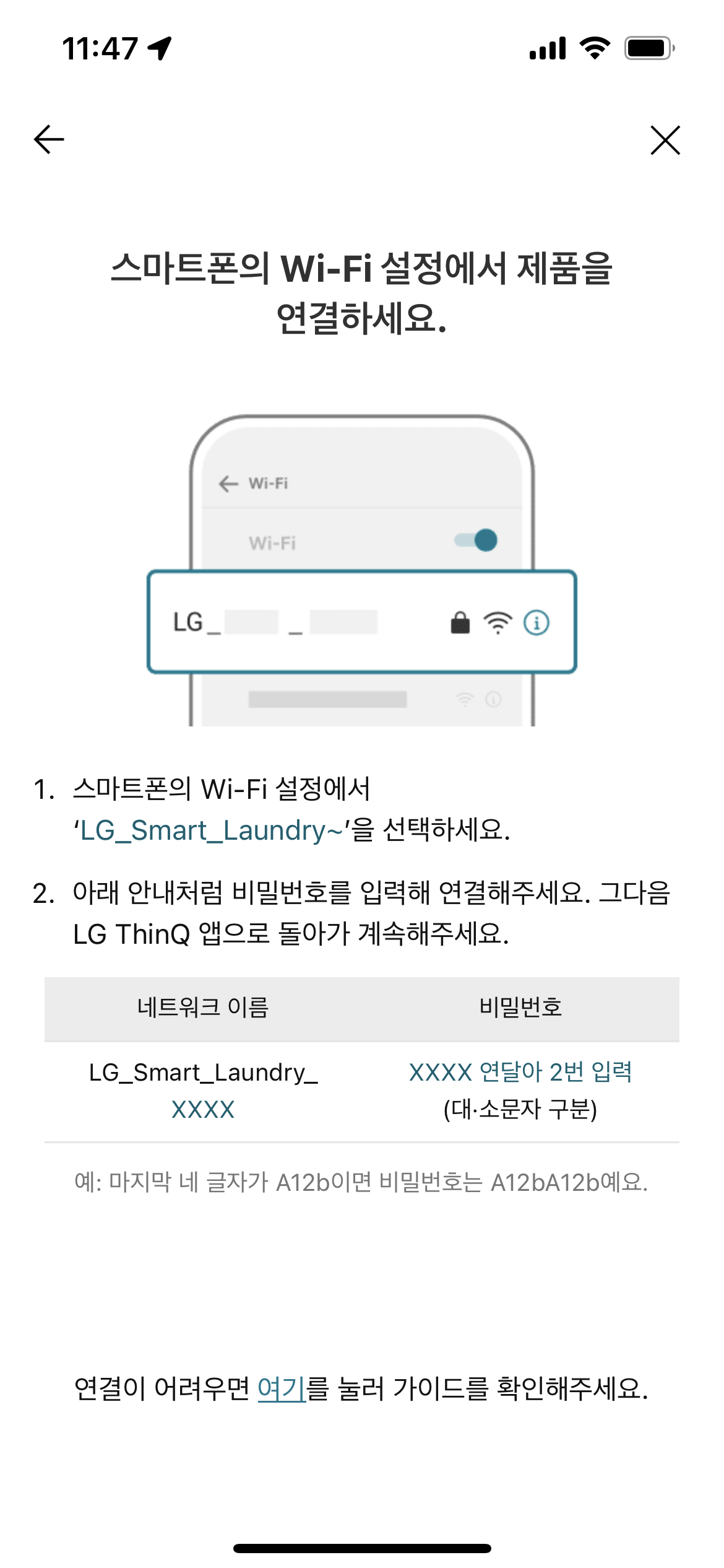 이제 스마트폰에서 와이파이 화면으로 들어가서 목록 중에 아래 안내대로 'LG_Smart_Laundry~'라는 식으로 표시된 와이파이를 선택하여 연결한다. 세탁기의 와이파이에 핸드폰을 연결하는 것이다. 비밀번호는 LG_Smart_Laundry 이후에 표시된 문자이다.