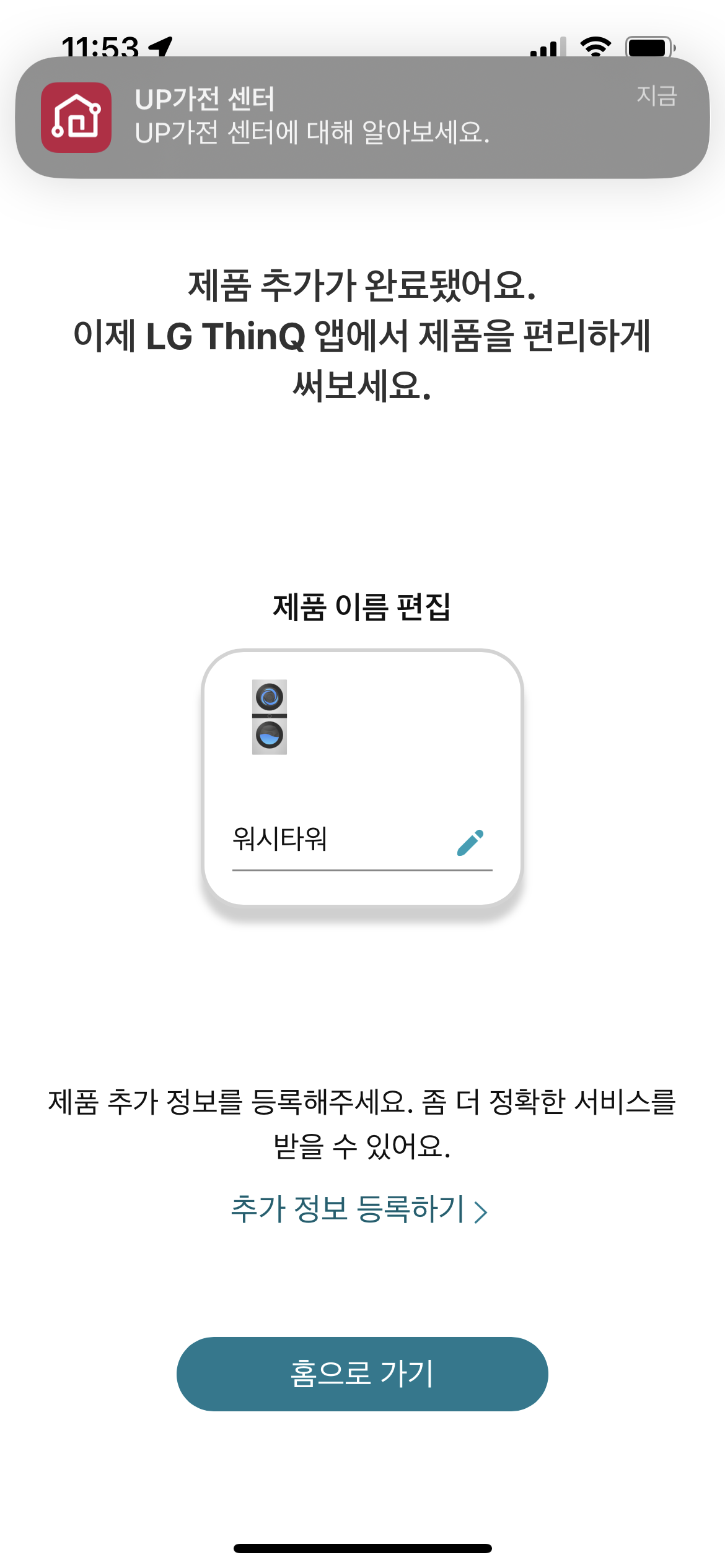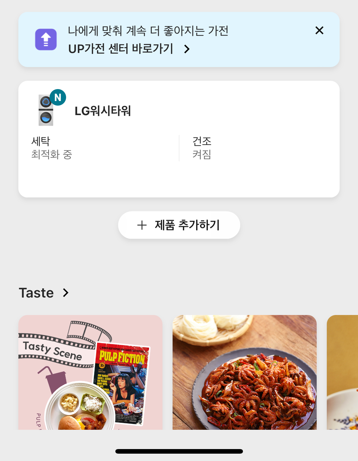 어플 메인화면에서 LG워시타워 세탁기가 추가된 것을 볼 수 있다.