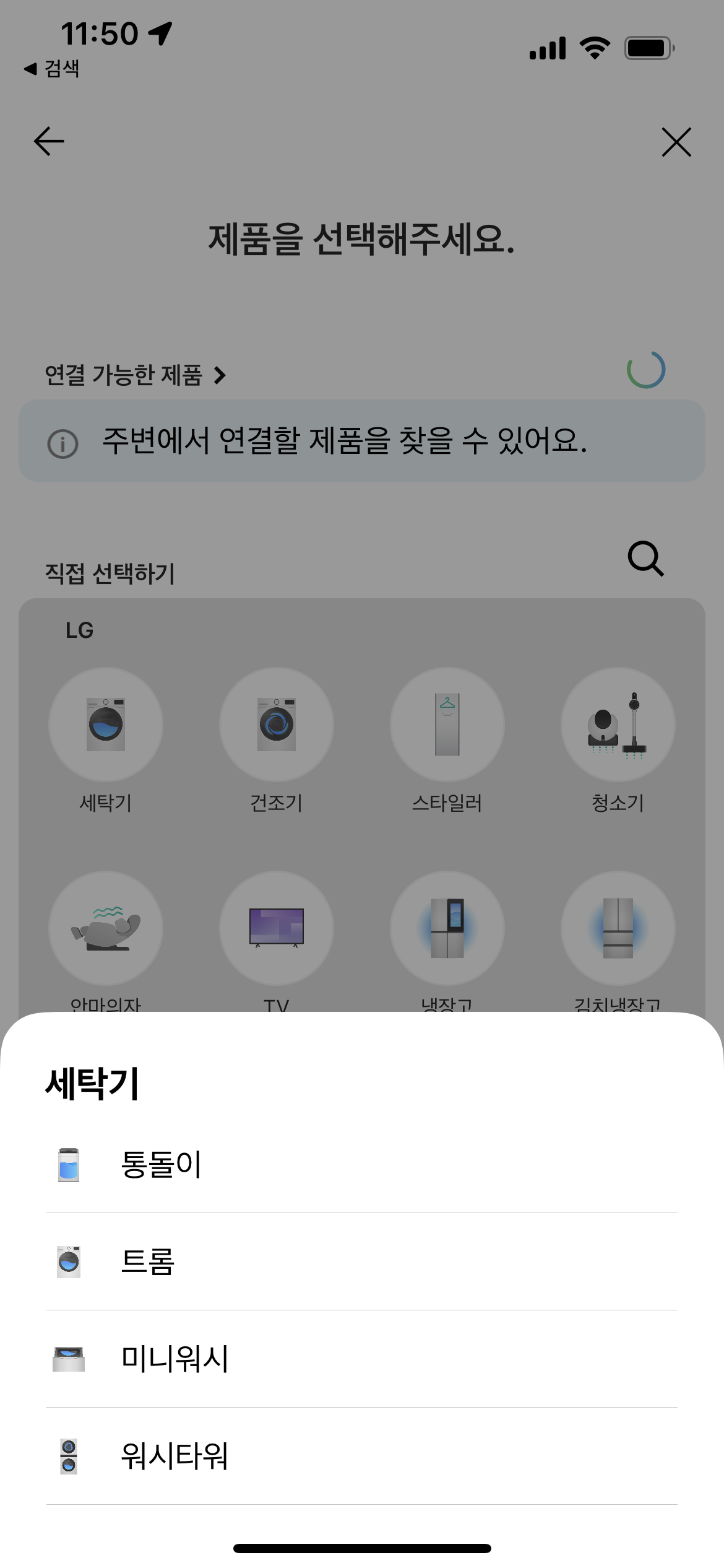만약 위 과정을 수동으로 제품을 선택할 경우는 아래처럼 '직접 선택하기'에서 세탁기를 선택하고 이후에 통돌이, 트롬 등 제품카테고리에 따라서 선택하면 된다.