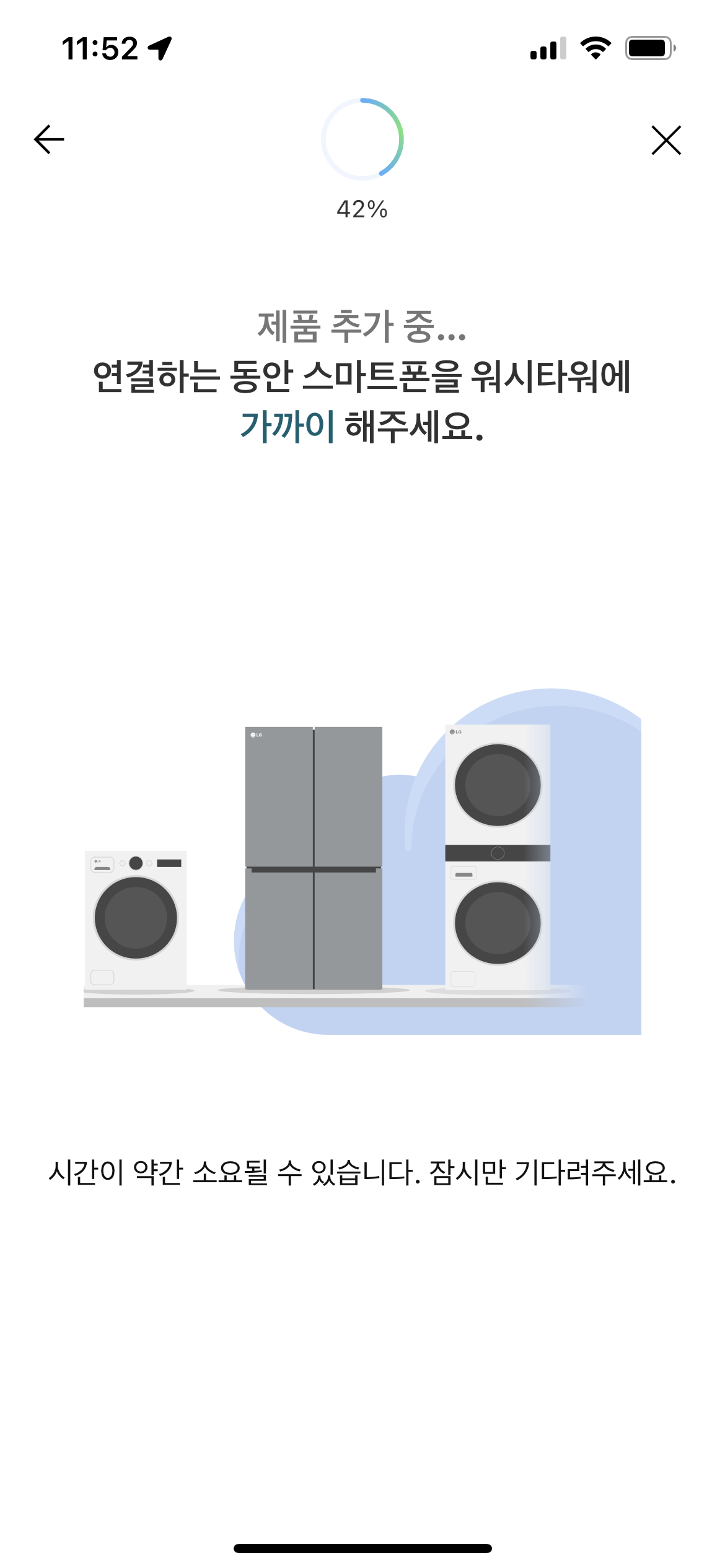 제품 추가 시작. 이 동안에는 핸드폰이 세탁기와 통신이 되도록 가까이 있어야 한다.