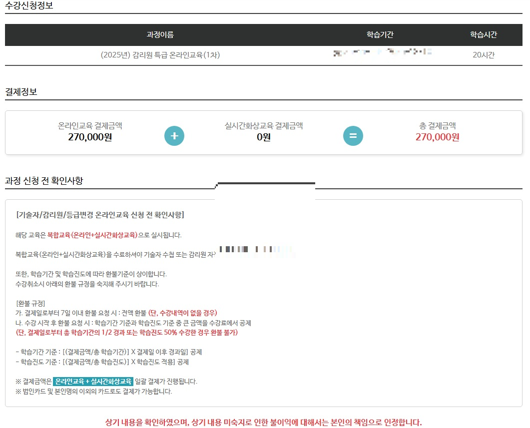1차 수강신청할 때 2차분 교육까지 한번에 결제하게 된다. 특급의 경우는 기술자, 감리원 모두 27만원이다.