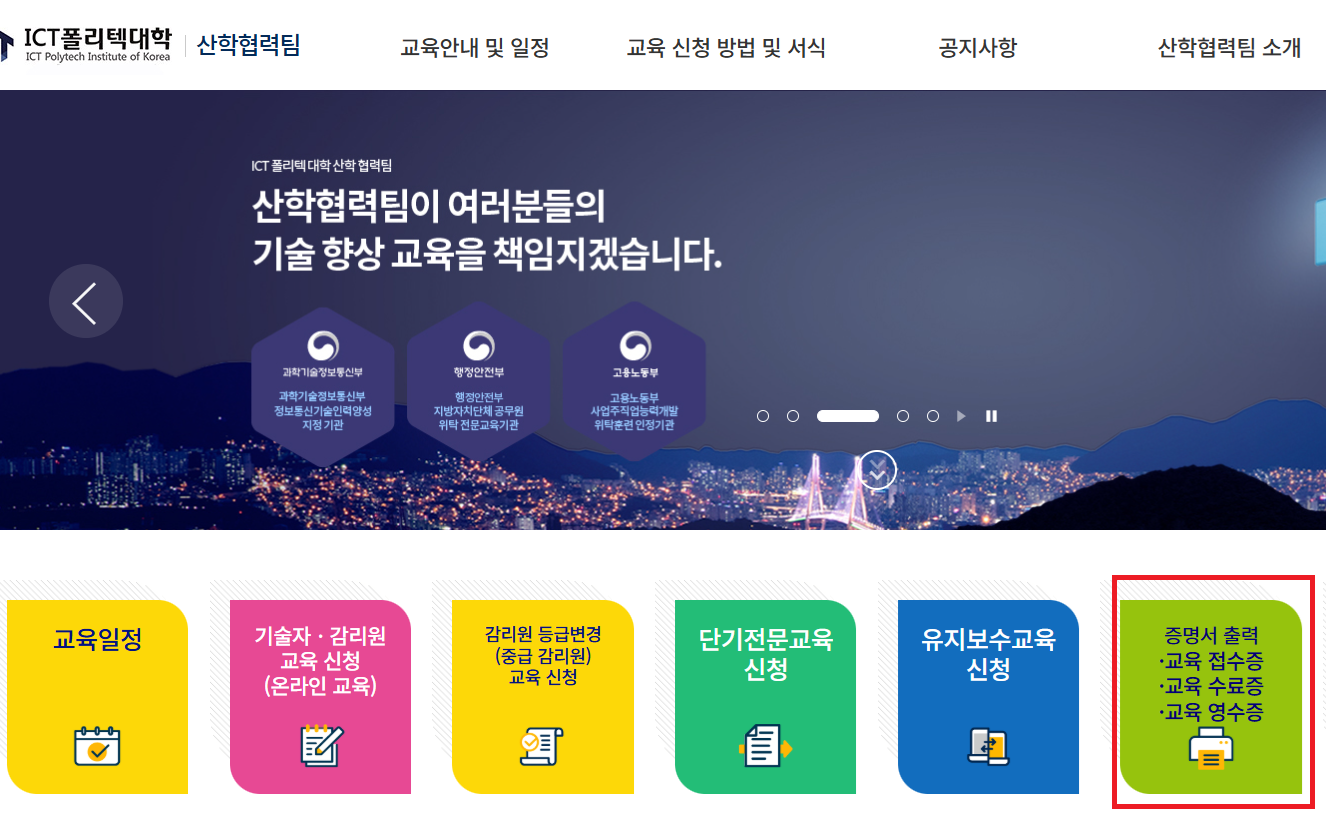 방법은 ICT폴리텍대학 홈페이지에 접속한다.