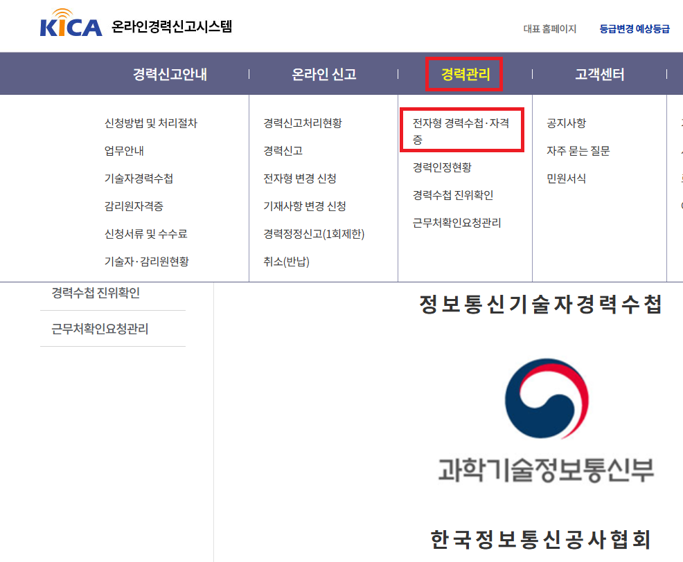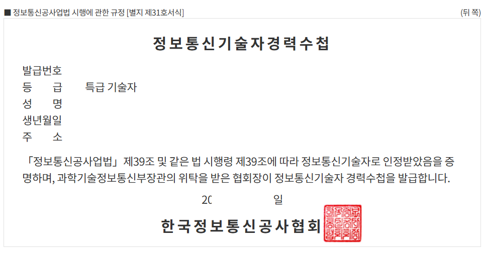 자격증은 한국정보통신공사협회 온라인경력신고시스템에서 출력 가능하다.