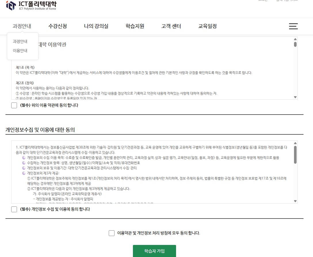 1. ICT폴리텍대학 회원가입을 한다. 한국정보통신공사협회 온라인경력시스템에서 경력신고가 완료되어야 회원가입이 가능하다. ICT폴리텍대학에 접속하여 '회원가입' 버튼을 클릭한다.
