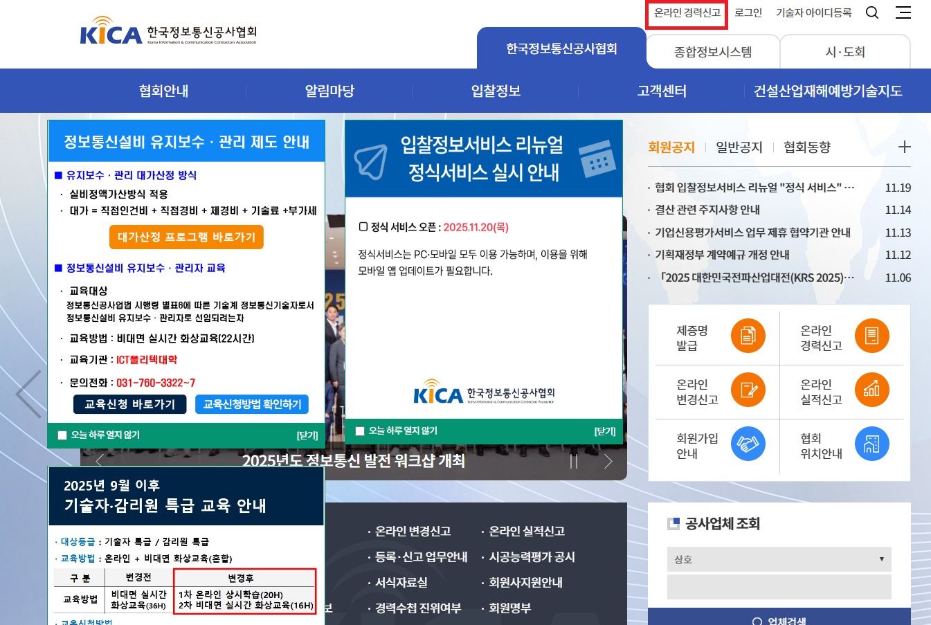 한국정보통신공사협회 온라인경력시스템에서 경력심사를 마친 경우(또는 오프라인 신청 및 심사 후) 관련 교육을 이수하고 수료를 해야 해당 기술자 자격이 발급된다.
