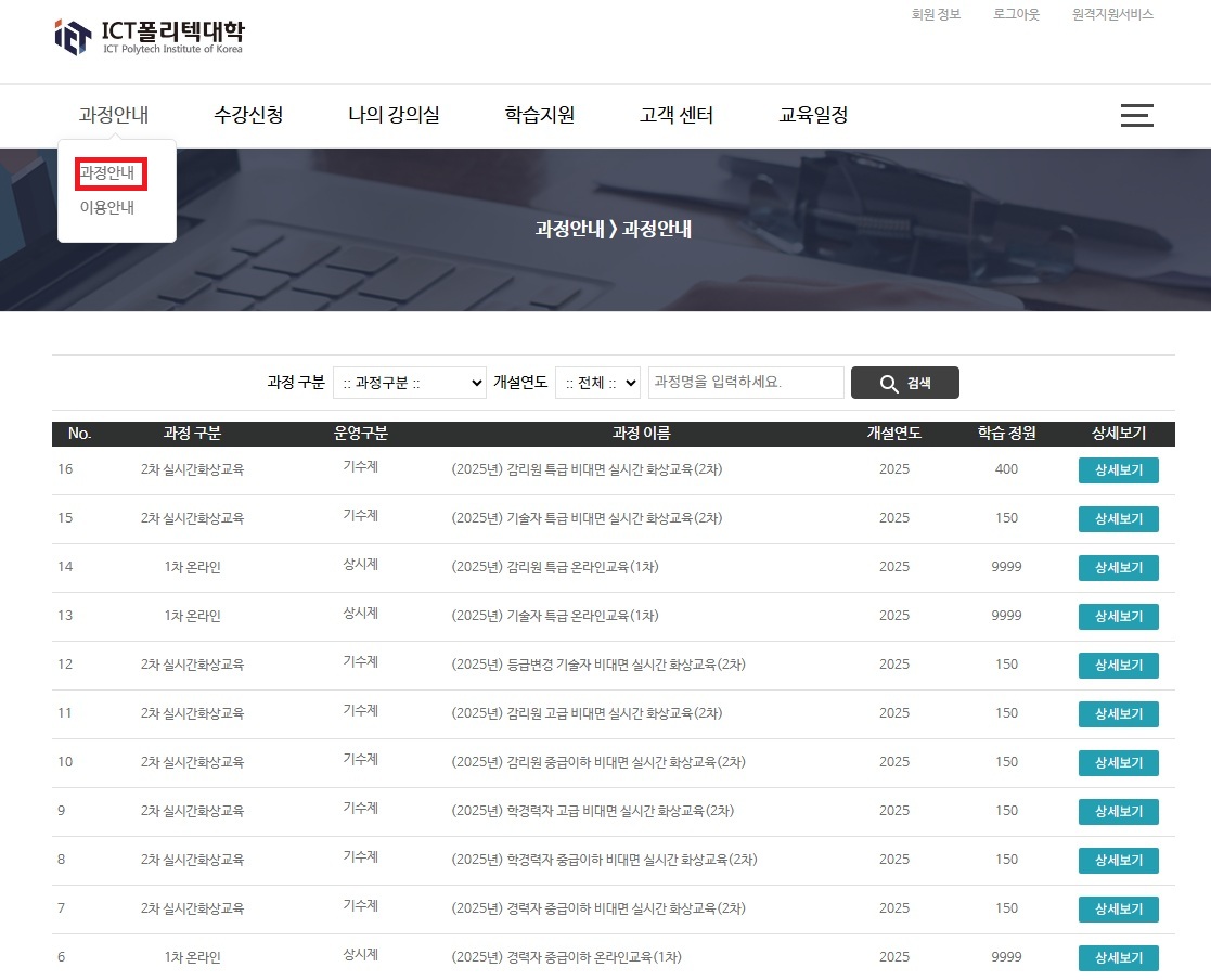 2. 교육을 신청한다. 과정에 대한 것은 홈페이지에서 '과정안내 - 과정안내'를 클릭하면 교육일정을 확인 가능하다.