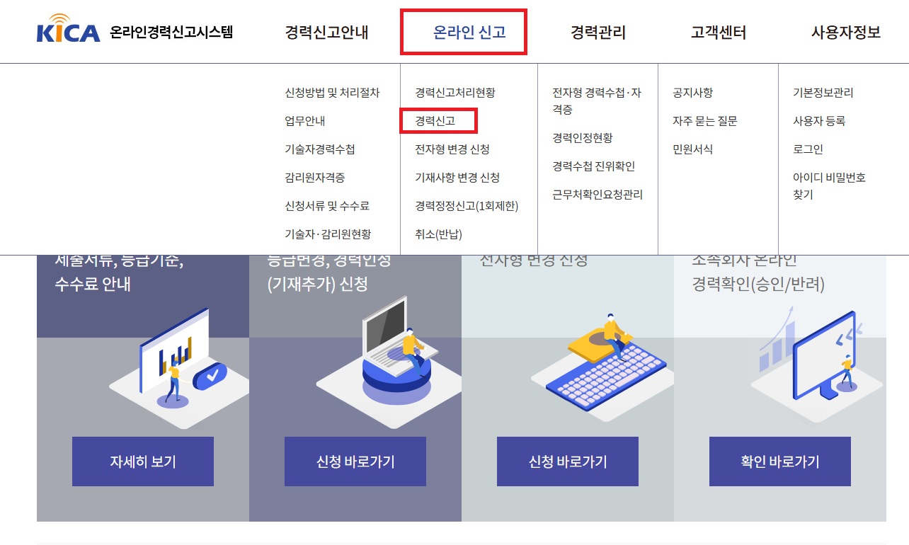 메뉴의 안내대로 정보를 입력한다. 이때 필요한 서류들은 대략 다음과 같다. 졸업증명서, 자격증사본, 경력증명서, 기술경력증명서(협회양식) 나같은 경우는 관련학과 졸업 및 자격증으로 진행했었다. 다른 자격으로 경력신고할 경우 준비서류에서 차이가 있을 수 있다.