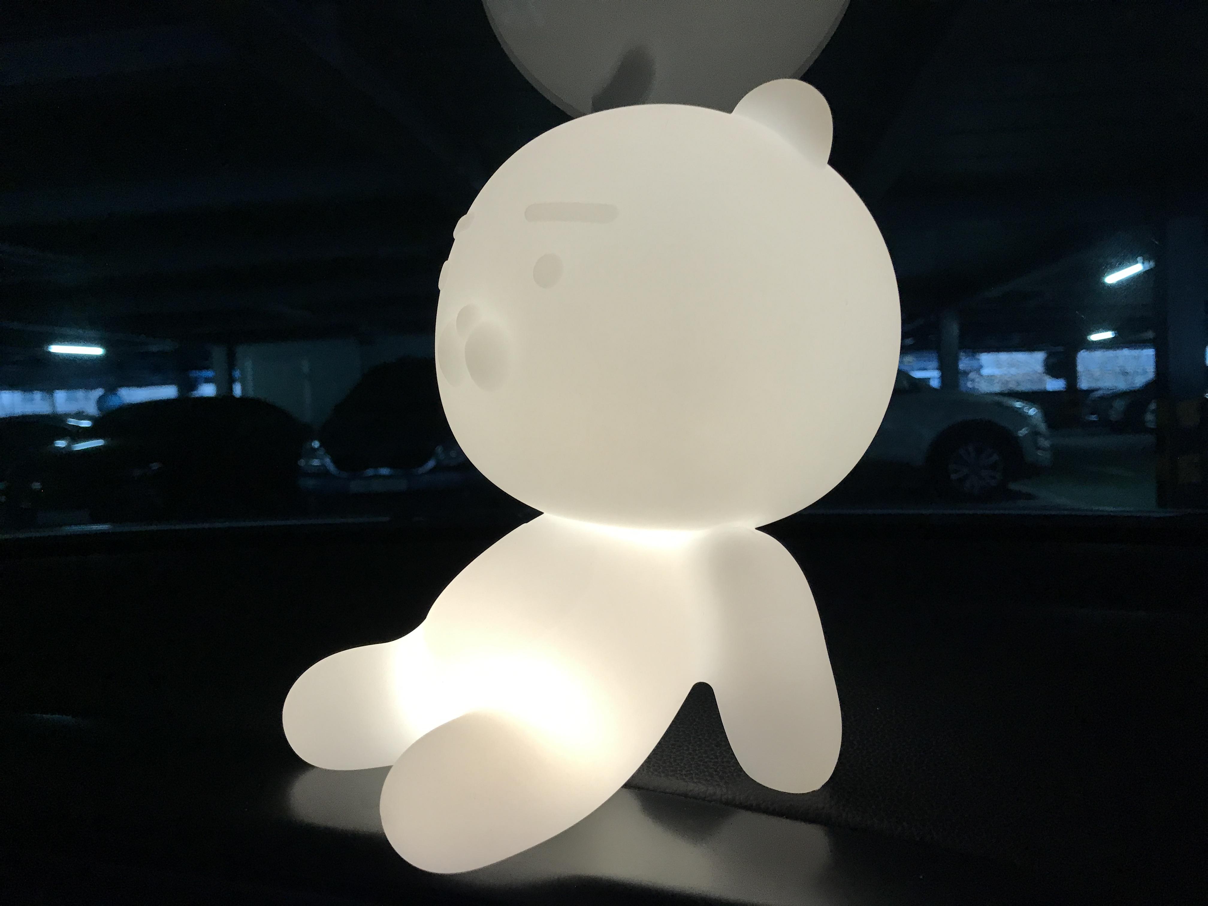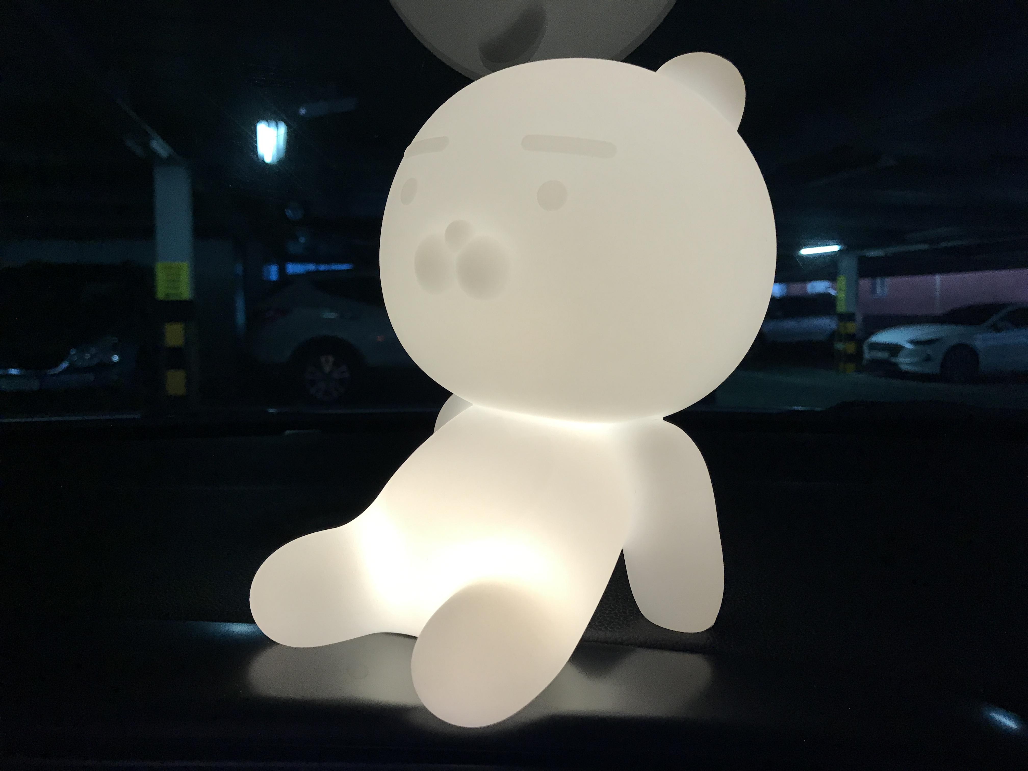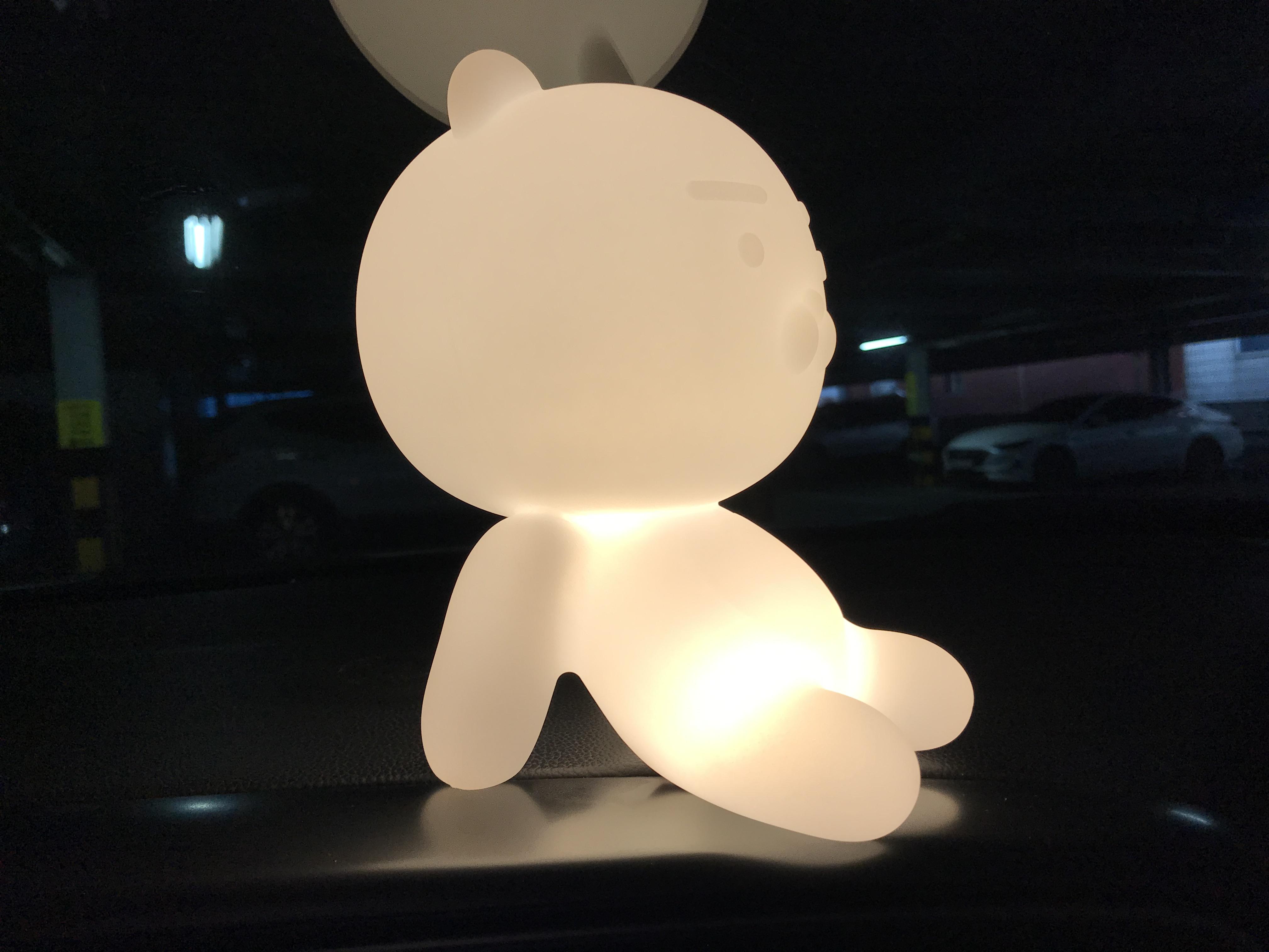 오래되어 배터리는 다 방전된 듯 해서 차안에서 보조배터리로 충전을 하고 주차장에서 켜봤다.라이언 바닥 엉덩이 부분에 스위치가 있는데 한번 누르면 약하게 켜지고 한번 더 누르면 좀더 밝게, 한번 더 누르면 꺼진다.1단계 밝기
