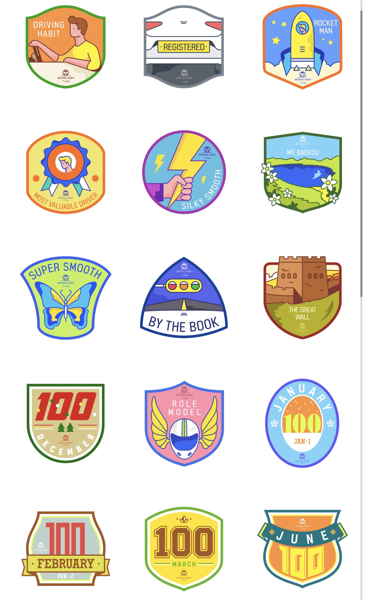 배지의 어지간한 것은 다 획득했다. 가장 획득 어려웠던 것이 아래 3개 운전고수, 백일주행, 티맵미식가였다.
